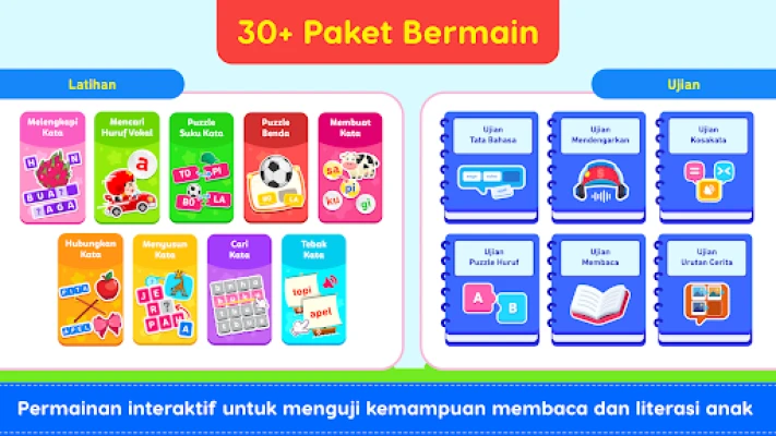 Proses belajar membaca semakin semarak dengan beragam permainan edukatif yang terintegrasi di dalamnya. Si kecil dapat mengasah kemampuan mereka melalui aktivitas seperti 'Tebak Membaca Kata', melatih kecepatan dan respons dalam 'Balon Kata', atau mengembangkan kemampuan kognitif dengan 'Mencocokkan Kata dan Gambar'. Tantangan lain yang menarik meliputi 'Puzzle Kata', 'Asah Kemampuan Membaca', 'Mencari Kata dalam Puzzle', dan 'Sambungkan Suku Kata', semuanya dirancang untuk memperkuat pemahaman dan meningkatkan kepercayaan diri anak dalam membaca melalui cara yang menyenangkan dan interaktif.