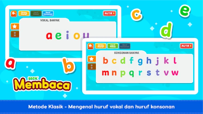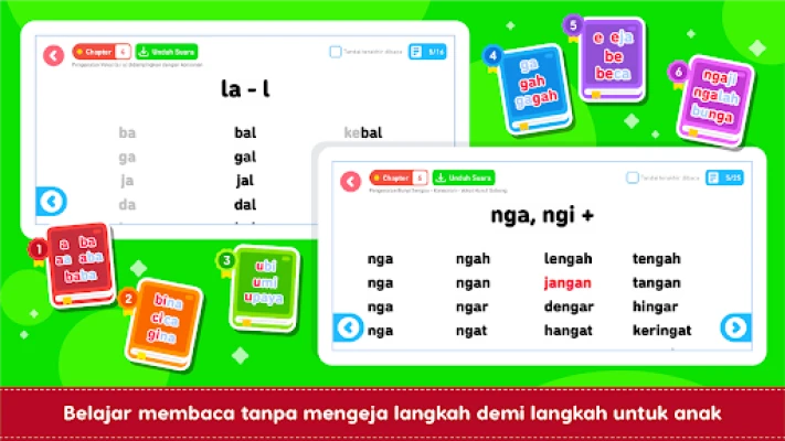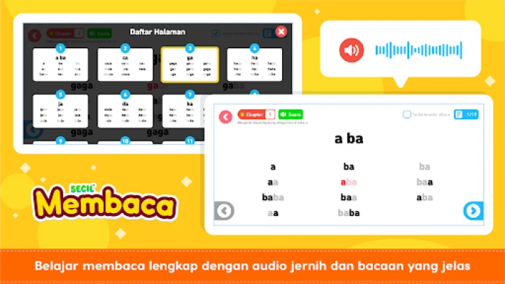 Secil Belajar Membaca adalah aplikasi edukasi anak yang membantu mereka belajar membaca huruf alfabet A-Z dan kata dasar dengan cara menyenangkan. Lewat metode tanpa mengeja, anak-anak diajarkan suku kata, vokal, dan konsonan agar cepat lancar membaca.